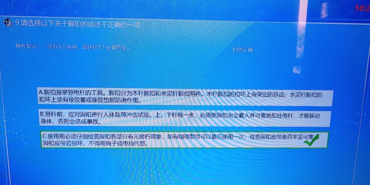 上杆(以登水泥杆为例):1.选定适当脚扣→根据脚型调整皮带的松紧→在预定工作位置下方;2.将右脚扣挂在杆上→系好腰带(使大带在左侧,以在臀部稍上为宜,不可过紧,也不要压住“五联”)→穿好左脚脚扣→将右脚踏于已在杆上的脚扣上并穿紧→上杆,直到预定位置→系好安全带,开始工作。