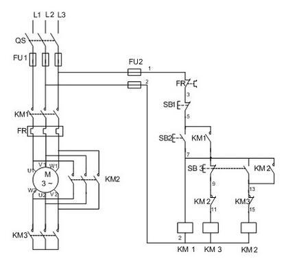 线路工作过程:1、合上电源开关QS接通三相电源。2、按下启动按钮SB2,交流接触器KM1及KM3的线圈通电吸合并自锁。KM1的三对主常触头闭合接通电动机定子三相绕组的首端,KM3的三对主触头将定子绕组尾端联在一起,电动机在Y接下低电压启动。3、随着电动机转速的升高,待接近额定转速时(或观察电流表接近额定电流时),按下运行按钮SB3,此时BS3的常闭触点断开KM3线圈的回路,KM3失电释放,常开主触头释放将三相绕组尾端连接打开,常闭触点复位闭合为KM2通电做好准备,而SB3的常开触点接通了KM2线圈回路,使KM2线圈得电并自锁,KM2主触头闭合将电动机三相绕组连接成△,使电动机在△接法下运行。完成了Y-△接压启动的任务。