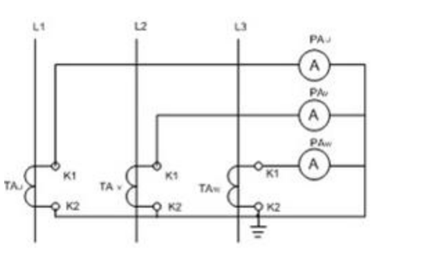 三只电流互感器的K1分别接三只电流表的任一接线端,三只电流表的另一端连接后再与三只电流表的K2端连接,并接地或接零。