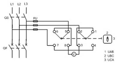 这种测量三相线电压的方法,常用在配电装置的受电柜上。接在隔离开关与断路器之间。接线原理图如下。