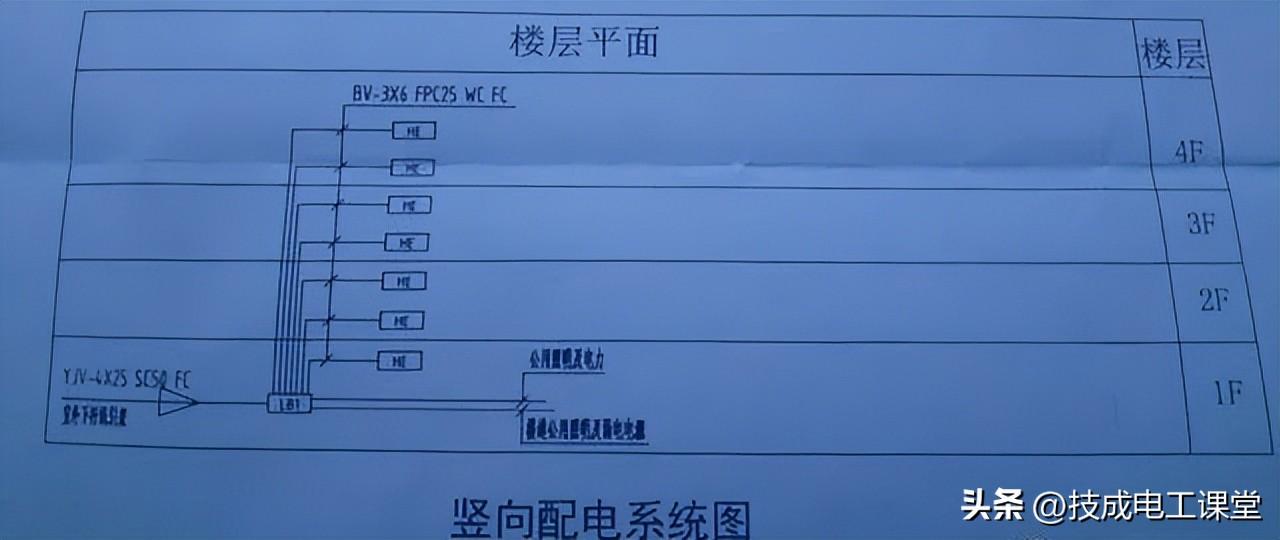 楼层配电系统图,让我们知道:这幢4层的建筑总共有8个配电箱,其中1F有个总箱LB1,一个分箱HE,其余每层两个分箱HE。均由1楼总箱单独引线3Ⅹ6,即3根6平方铜线。总箱还包括楼道及弱电等公共用电部分。