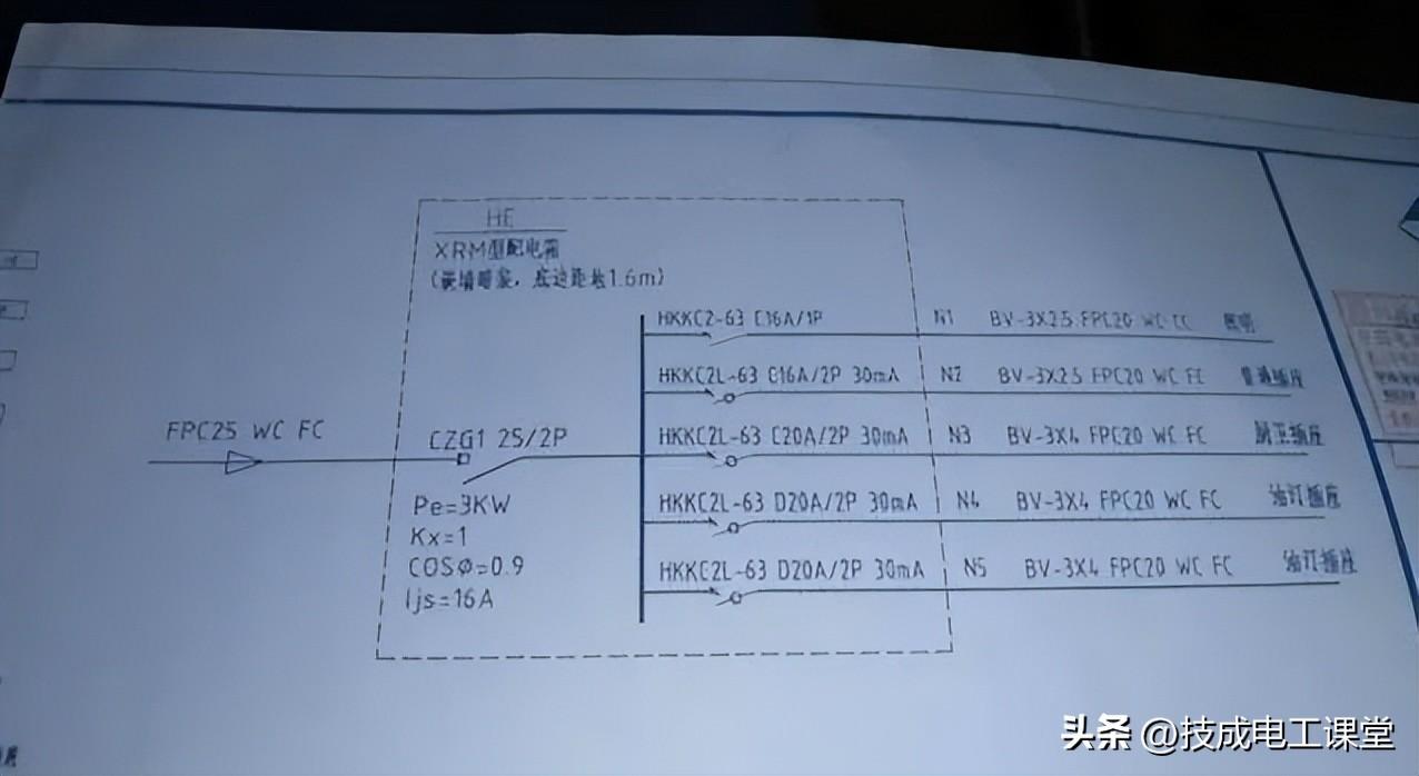 HE箱共有五个回路N1~N5,照明回路HKKC2-63 C16A/1P 表示为塑壳式小型断路器,1P即1极,只接一根火线,C16A表示普通家用断路器,额定电流16A,不带漏电。BV-3x2.5FPC20 WC CC表示3根2.5平方电线,穿20阻燃线管,沿墙面、顶面暗敷设。如上图。