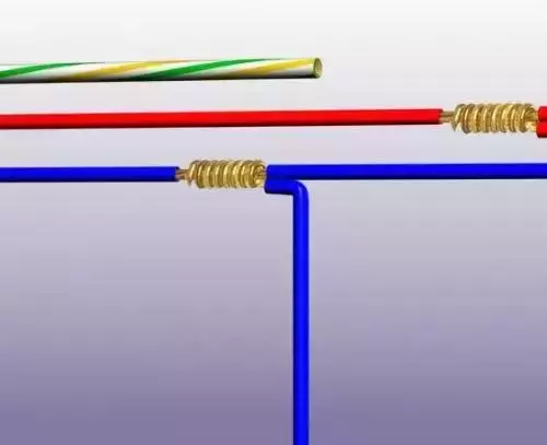 剖削干线和支线的绝缘层,绞紧支线靠近绝缘层1/8处的线芯,散开支线线芯,拉直并清洁表面,所示。把支线线芯分成4根和3根两组排齐,将4根组插入干线线芯中间,所示。把留在外面的3根组线芯,在干线线芯上顺时针方向紧密缠绕4~5圈,切除余下线芯钳平线端。再用4根组线芯在干线线芯的另一侧顺时针方向紧密缠绕3~4圈,切除余下线芯,钳平线端,所示完成T形分支连接。