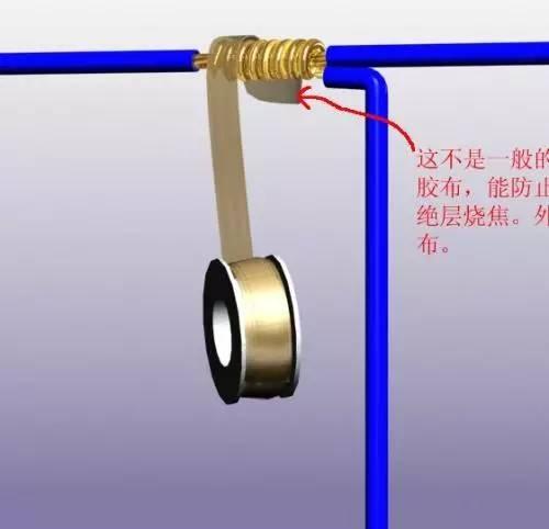 下面是第二种接法(防火胶布隔离法),多用于吊项内,或比较高能的工程中,主线不能能弄断,符线绕主线6--8周,吊顶内的射灯,一路上要有很多灯就是这样接法,用防火胶布缠在里面,它的作用就是防止电打火烧坏东西,这是在吊顶内很重要。外面再用绝缘胶布缠绕。