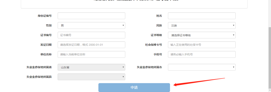 下面以山东省为例,在山东省本级、济南市、淄博市、枣庄市、东营市、烟台市、潍坊市、济宁市、泰安市、威海市、日照市、莱芜市、临沂市、德州市、聊城市、滨州市、菏泽市参加失业保险的企业职工,登录参保地市级人力资源社会保障部门门户网站或省人力资源社会保障厅门户网站,办理网上申请。