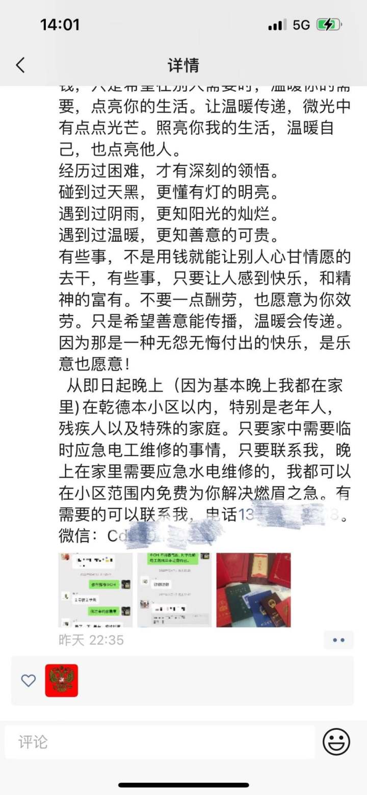 经过此事,蒋爸爸做了个决定,在乾成园小区以内,特别是老年人、残疾人以及特殊的家庭,只要家中需要临时应急电工维修的事情,都可以联系他免费上门。