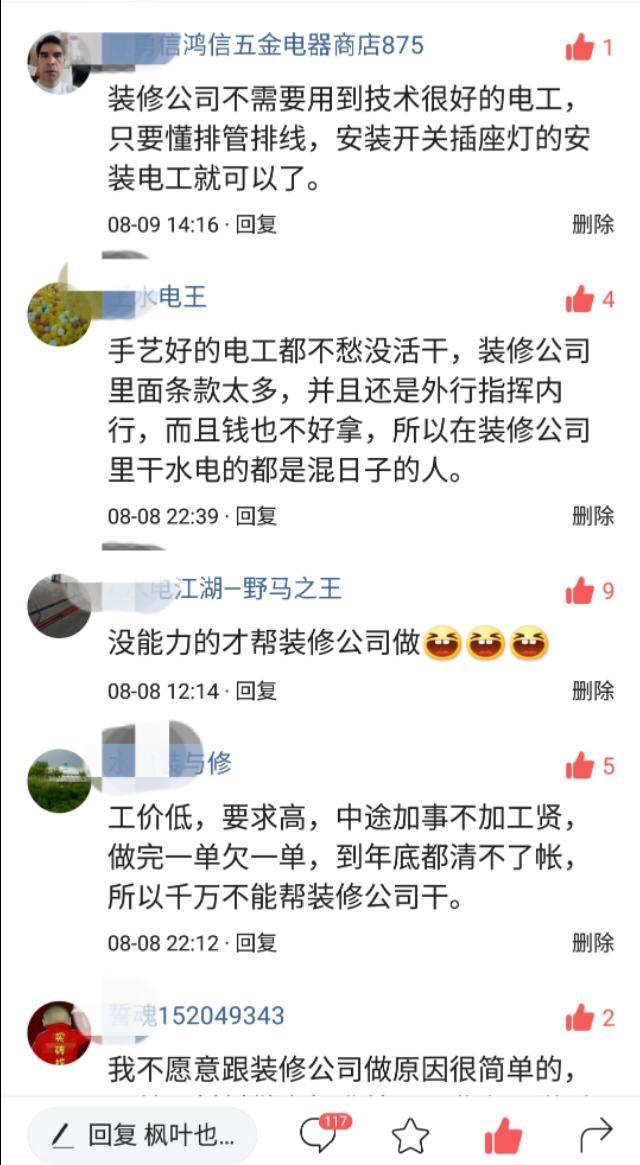 前天写了两篇文章,一篇是:【电工都不太愿意跟装修公司做,为什么?】另一篇是:【今年的电工哪里去了?啷个难找?】结果引起了电工师傅对装修公司的种种吐槽。