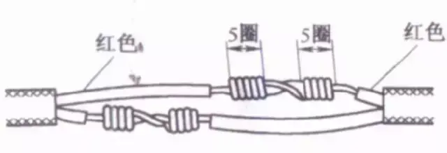 把细导线线头在粗导线线头上紧密缠绕5~6圈,弯折粗线头端部,使它压在缠绕层上,再把细线头缠绕3~4圈,剪去余端,钳平切口。