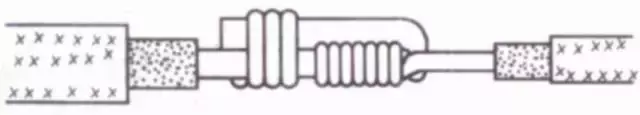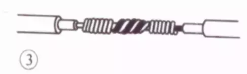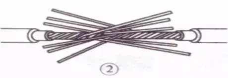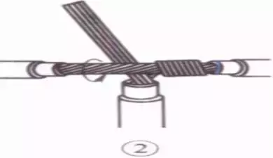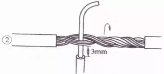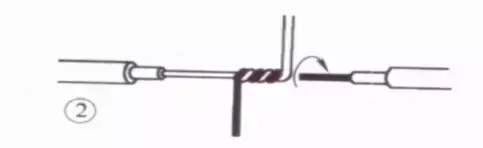 接着把这两股芯线按顺时针方向紧缠2圈后,再折回90° 并平卧在折起前的轴线位置上。