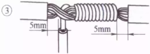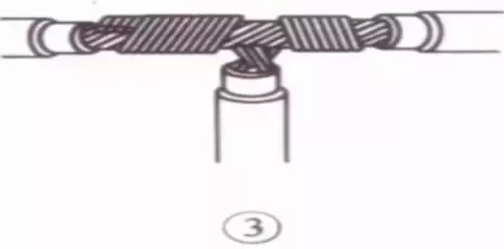 把3根线芯的一组在干线右边按顺时针方向紧紧缠绕3~4圈,并钳平线端;把4根芯线的一组在干线的左边按逆时针方向缠绕4~5圈。