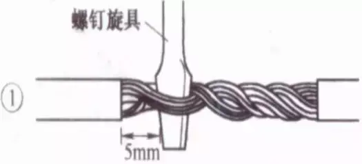 将支路芯线的线头与干线芯线十字相交,在支路芯线根部留出5mm,然后顺时针方向缠绕6~8圈后,用钢丝钳切去余下的芯线,并钳平芯线末端。