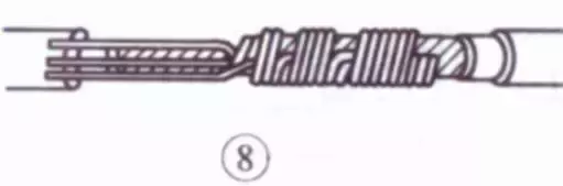 把余下的3根芯线按步骤⑤ 方法缠绕至第2圈时,把前4根芯线在根部分别切断,并钳平;接着把3根芯线缠足3圈,然后剪去余端,钳平切口不留毛刺