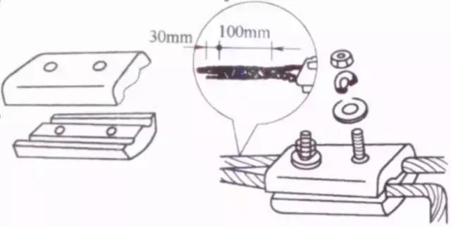 连接前,先用钢丝刷除去导线线头和沟线夹线槽内壁上的氧化层和污物,涂上凡士林锌膏粉(或中性凡士林),然后将导线线卡入线槽,旋紧螺栓,使沟线夹紧紧夹住线头而完成连接。为防止螺栓松动,压紧螺栓上应套以弹簧垫圈。