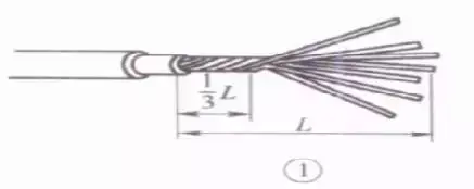 先将剥去绝缘层的芯线头散开并拉直,再把靠近绝缘层1/3线段的芯线绞紧,然后把余下的2/3芯线头按图示分散成伞状,并将每根芯线拉直。