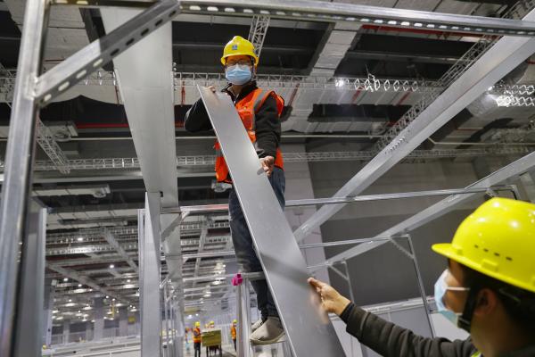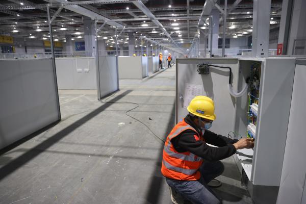 4.1号馆内,29岁的向舒华一张床一张床地“扫”过去,依次为每张病床安装上电线槽和开关面板。密密麻麻的病床一眼望不到头,他的身影在其中显得十分渺小。“从中间那根柱子到这里,一整片都是我负责的范围。”一天下来,他说已经记不清自己安装了多少。