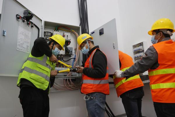 向舒华(左一)和杜维(右三)合作完成电缆压接。