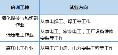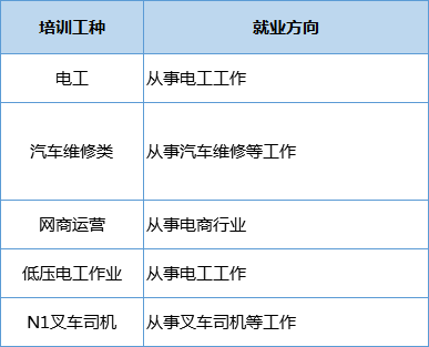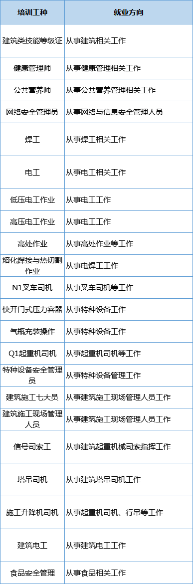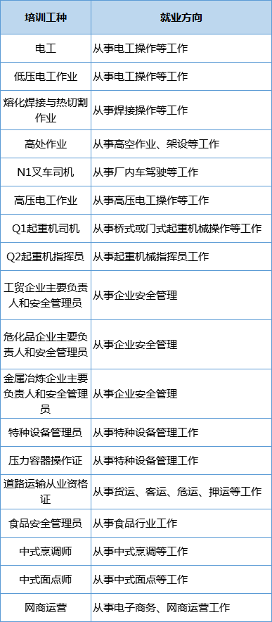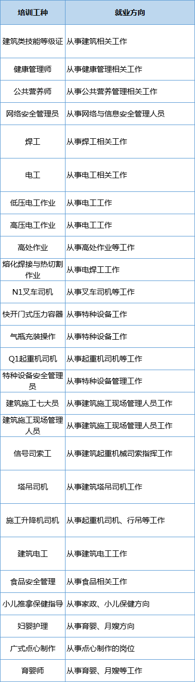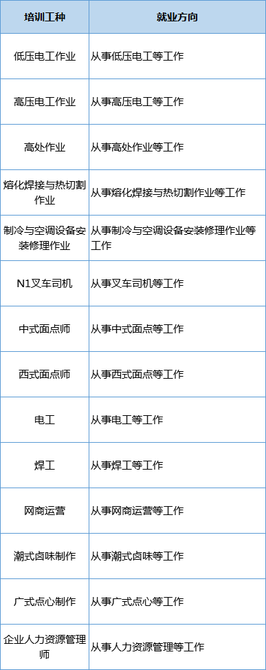 低压电工作业、高压电工作业、高处安装维护拆除作业、熔化焊接与热切割作业、制冷与空调设备安装修理作业、叉车司机(N1)、中式面点师、西式面点师、电工、网商运营、潮式卤味制作、广式点心制作