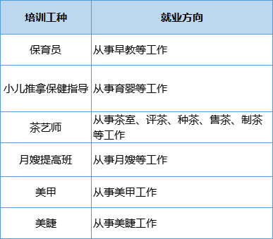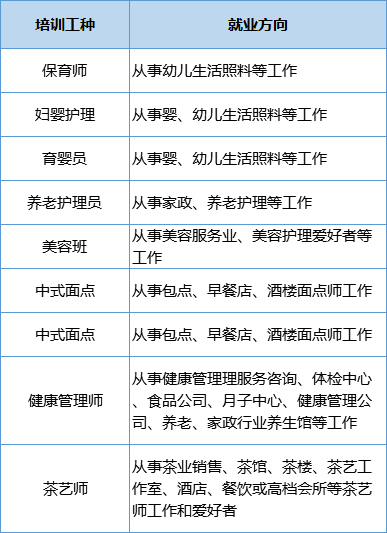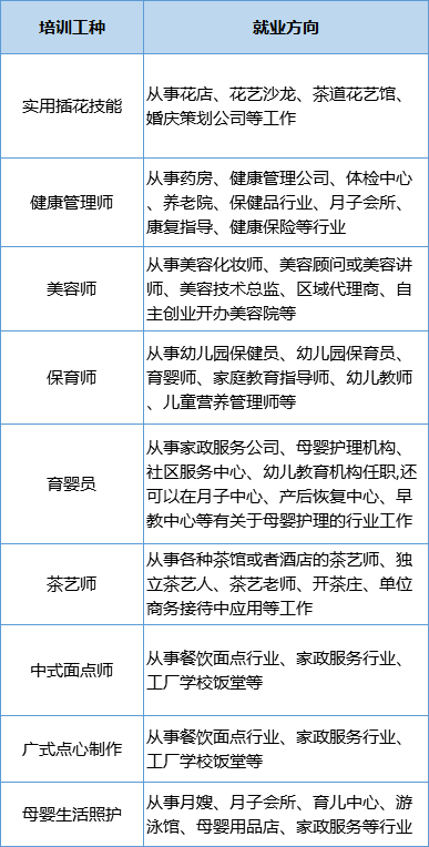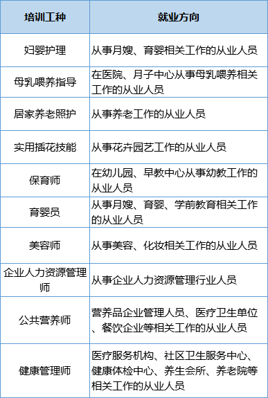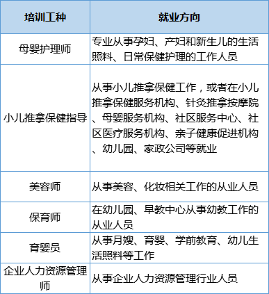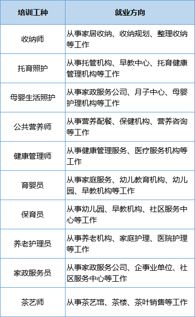 妇婴护理、母乳喂养指导、居家养老照护、实用插花技能、保育师、育婴员、美容师、企业人力资源管理师