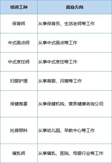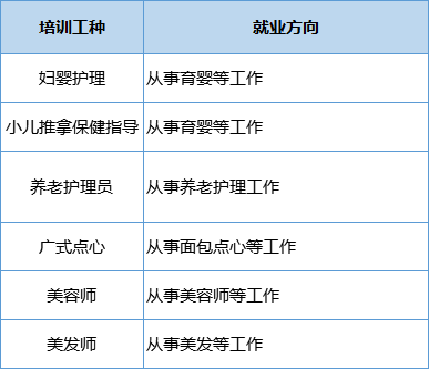 妇婴护理、小儿推拿保健指导、广式点心、美容、美发、SYB创业培训