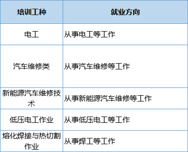 电工、汽车维修工(含汽车机械维修工、电器维修工、检验工、汽车美容)、低压电工、熔化焊接与热切割(焊工)