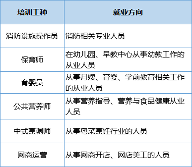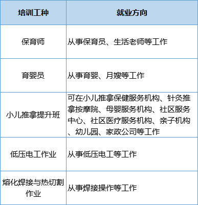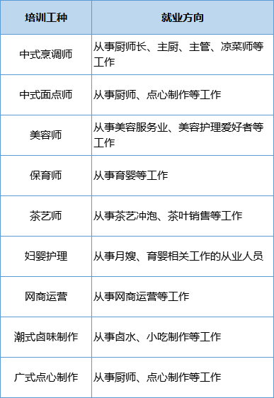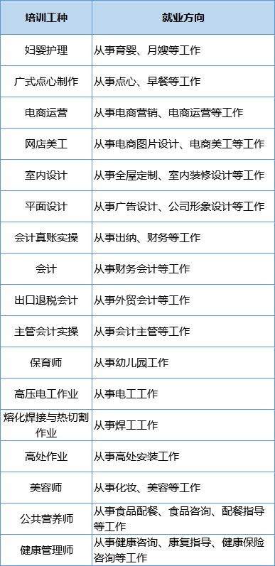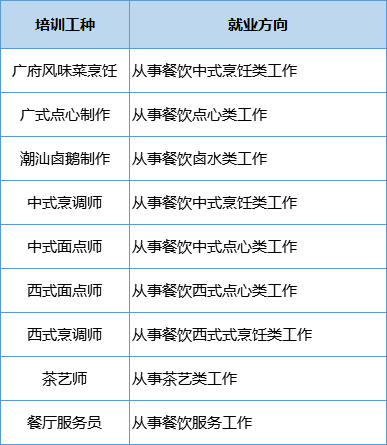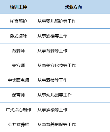 电工、焊工、妇婴护理、广式点心、潮式卤味、广府风味菜、广东烧味制作、育婴员、美容师