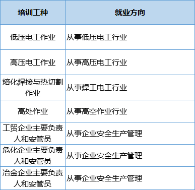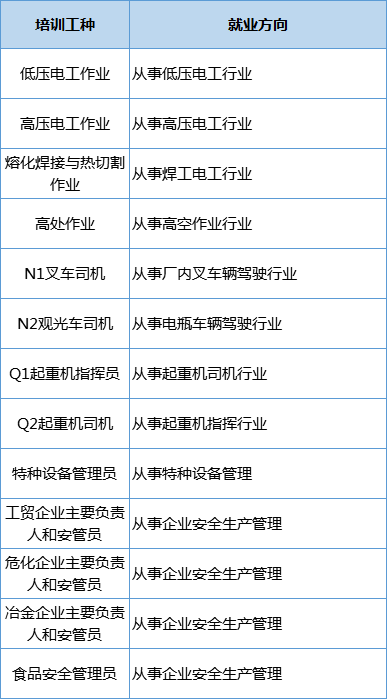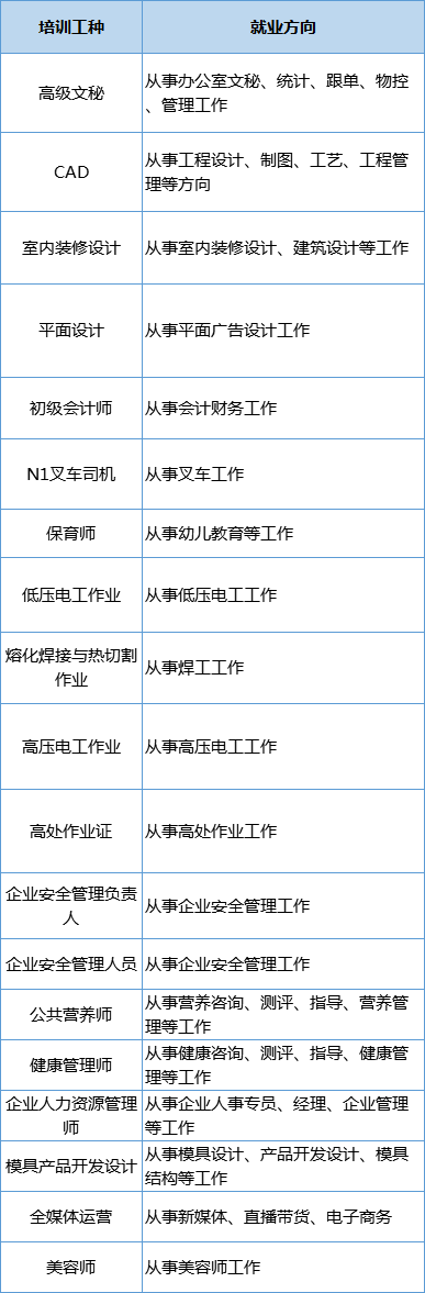 低压电工作业、焊接与热切割作、高压电工作业、高处作业证、初级会计应用班、高级文秘、CAD、室内装修设计、平面设计、保育员、叉车、电工、美容师、妇婴护理、小儿推拿、广式点心、企业班组长干部培训班、企业安全管理负责人、企业安全管理人员