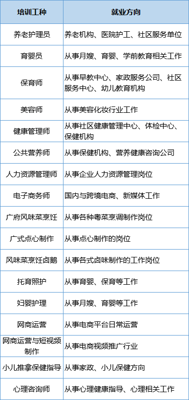 育婴员、保育师、美容师、健康管理师、公共营养师、人力资源管理师、电子商务师、广府风味菜烹饪、广式点心(中西式)、风味菜烹饪卤鹅、托育照护、妇婴护理、网商运营、网商运营与短视频制作、小儿推拿保健(20满人)、心理咨询师
