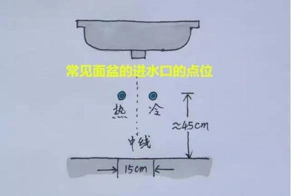 面盆进水口左冷右热,间距15公分。但这里不是特别严格,因为水口到龙头是用软管连接的,间距远些近些不是特别重要,甚至为了让水管少出现焊点,走成了左冷右热也不碍事。