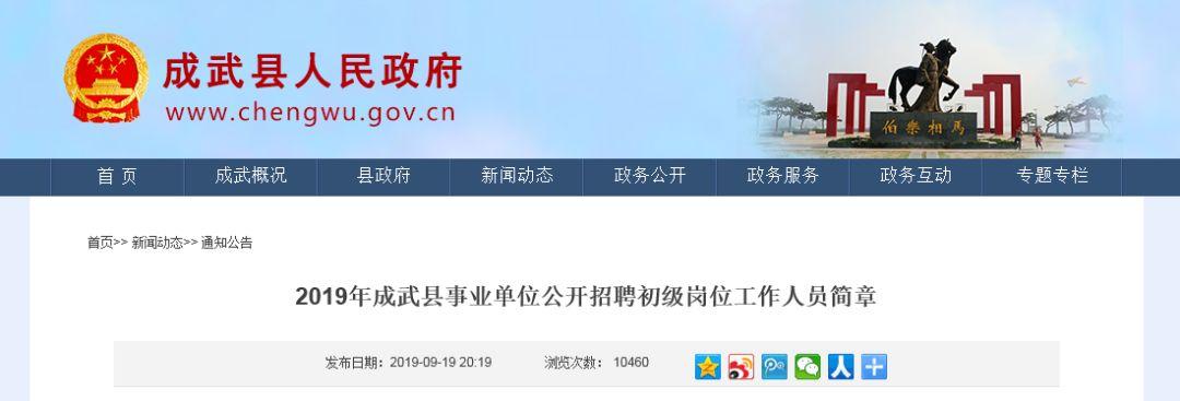 根据《事业单位人事管理条例》(国务院令第652号)、《山东省事业单位公开招聘工作规程》等文件规定,按照2019年公开招聘计划和工作需要,现将我县部分县直单位和镇(办)事业单位公开招聘工作人员有关事项公告如下:一、应聘条件(一)具有中华人民共和国国籍;(二)遵守宪法和法律,具有良好的道德品行;(三)具有普通全日制大学本科及以上学历学位(定向岗位除外);(四) 具有岗位所需的专业或技能条件,适应岗位要求的身体条件;(五) 年龄在40周岁以下(1978年9月26日以后出生,以身份证年龄为准);(六) 具备招聘岗位所需的其它资格条件。根据国家有关规定,由我省统一招募和选派的“选聘高校毕业生到村任职”、“三支一扶”计划、“大学生志愿服务西部计划”等服务基层项目人员(须在菏泽从事基层服务的或者服务基层项目人员生源是菏泽,以下简称服务基层项目人员),服务满2年且完成聘用合同(协议书)规定的服务期限、考核合格,3年内(指2015年至2017年招募和选派的服务基层项目人员)应聘的,全日制普通高等院校专科及以上学历的大学生退役士兵,在部队服役满2年以上,已在成武县退役军人事务局报到且符合我县兵役机关接受安置条件的可报考定向招聘职位。已享受优惠政策被录用为公务员或招聘为事业单位工作人员的,不再享受该优惠政策。在职人员应聘须经有用人权限部门或单位同意。定向、委培毕业生报考,须征得定向、委培单位同意。已与用人单位签订就业协议的2019年应届毕业生,应聘前与签约单位解除协议或经签约单位同意,可以应聘。成武县机关事业单位财政拨款(全额)在编在职人员不能应聘。曾受过刑事处罚和曾被开除公职的人员、在读全日制普通高校非应届毕业生、现役军人以及法律法规规定不得聘用的其他情形的人员不得报考,在读全日制普通高校非应届毕业生不能用已取得的学历学位作为条件报考。二、招聘岗位及招聘人数具体招聘岗位、招聘人数及条件要求详见《2019年成武县事业单位公开招聘初级岗位工作人员岗位统计表》(附件)。三、报名与资格审查采取统一时间、网上报名、网上确认、网上缴费、现场认定的方式进行。(一)报名报名时间:2019年9月26日 9:00—9月29日18:00查询时间:2019年9月26日11:00—9月30日16:00报名网址:http://www.chengwu.gov.cn/(成武县人民政府网)1、网上报名报考人员登陆指定的报名网站,如实填写、准确提交个人信息资料,并按要求上传本人近期一寸免冠正面照片,上传照片应保证清晰可辨。每人限报一个岗位,报考人员在资格初审前多次登录填交报名信息的,后一次填报自动替换前一次填报信息。报名资格一经初审通过,不能更改个人信息。报考人员必须使用二代身份证报名,报名与考试时使用的身份证必须一致。报名人员恶意注册报名信息扰乱报名秩序或者伪造学历证明及其他有关证件获取考试资格的,查实后取消本次报名资格。2、网上初审审核时间:2019年9月26日11:00—9月30日14:00审核部门根据报考人员提交的信息资料进行资格初审,确定初审结果(节假日不休息)。对未通过初审的人员,要说明理由;对提交材料不全的,应注明缺失内容,并退回报名人员补充。初审通过后,报名信息不能更改。3、网上缴费缴费时间:2019年9月27日11:00--9月30日16:00报考人员初审通过后,要在规定时间内登录成武县人民政府网进行网上缴费,逾期不办理网上缴费手续的,视为放弃。根据鲁价费函〔2016〕2号核定的标准,考务费的收取标准为每人每科40元。报考人员缴费成功后,下载打印《事业单位公开招聘报名登记表》(以备参加现场资格审查时使用),并于2019年10月14日9:00—10月19日09:00期间登录该网站打印准考证。享受减免有关考务费用的农村特困大学生、城市低保人员,通过网上初审后,应于2019年9月29日9:00—9月30日16:00到成武县人力资源和社会保障局办理笔试考务费减免手续(逾期不再受理)。办理减免考务费时,应出具以下材料:《事业单位公开招聘报名登记表》;享受国家最低生活保障金的城镇家庭的报考人员,提交家庭所在地的县(区、市)民政部门出具的享受最低生活保障的证明和低保证(原件和复印件);农村绝对贫困家庭的报考人员,提交家庭所在地的县(区、市)扶贫办(部门)出具的特困证明和特困家庭基本情况档案卡(原件和复印件)。网上报名结束后,对最终确定的报考人数达不到1:3比例的招聘岗位,计划招聘1人的,取消招聘计划;计划招聘2人以上的,按规定的比例相应核减招聘计划,取消核减的计划将予以网上公告,请考生根据公告要求办理改报等事宜。定向岗位达不到1:3比例时,取消岗位招聘计划,定向岗位招聘人数自动转为本招聘单位管理岗位招聘人数,已报考定向岗位人员改报招聘岗位应符合招聘岗位报名条件。(二)资格审查对报考人员的资格审查工作,贯穿于招聘工作的全过程。拟进入面试的报考人员,按应聘岗位需求条件,提交本人相关证明材料及《事业单位公开招聘报名登记表》,同时提交一寸同底版近期免冠照片5张(与网上报名同底版),到成武县人力资源和社会保障局综合服务大厅二楼进行现场资格审查。资格审查时间内未提交有关材料者,视为弃权;经审查不具备报考条件的人员,经县人力资源和社会保障局批准后取消面试资格。因弃权或取消资格出现的职位人员空缺,按该职位人员笔试成绩合格线内依次