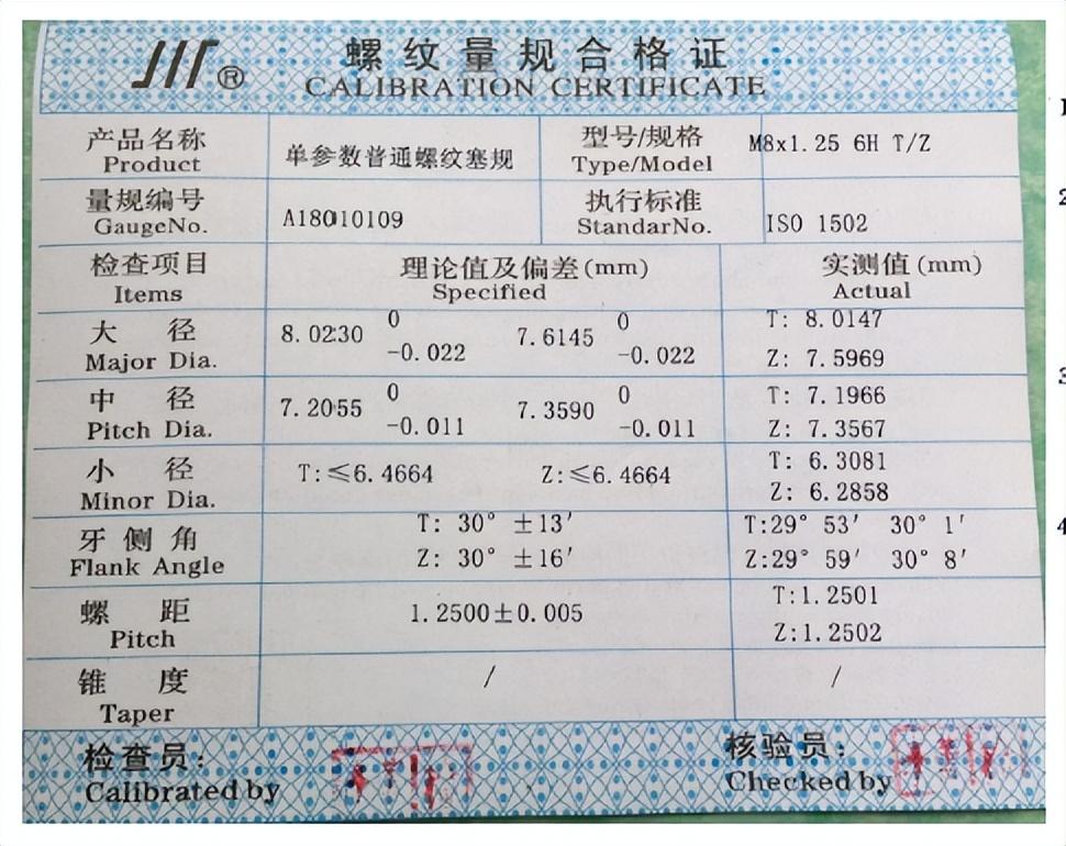 全单项参数量规--量规各个单项参数均检测合格(参数包括大径、中径、小径、螺距、半角、锥度)