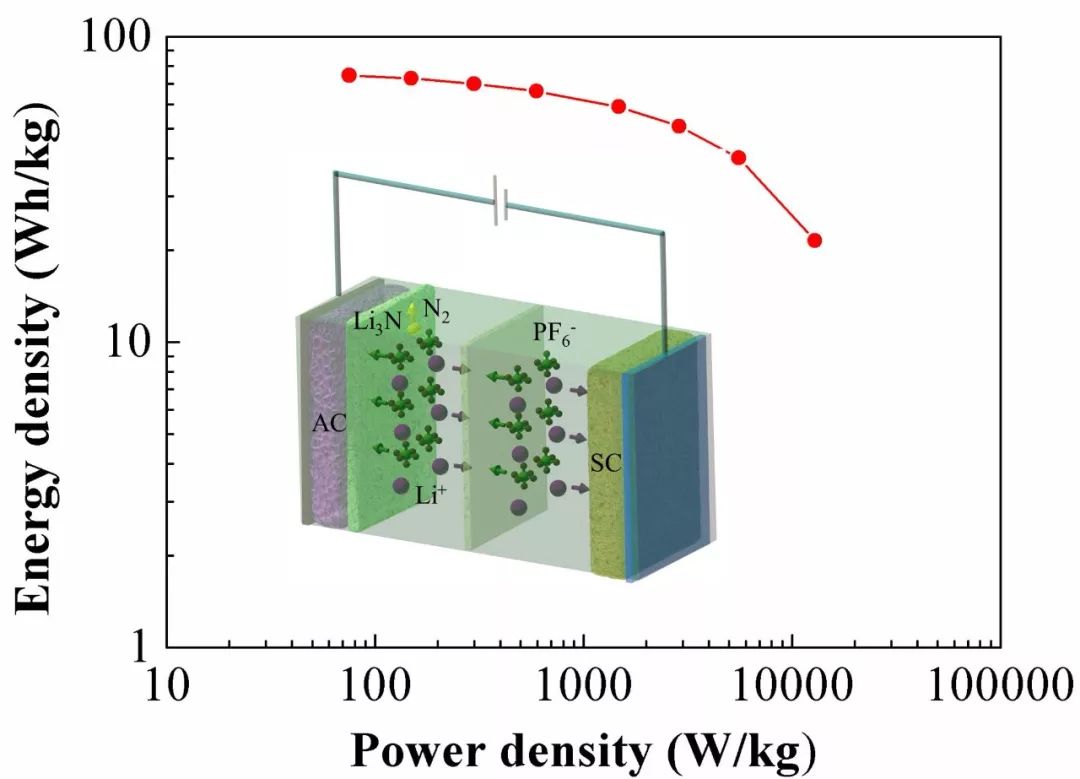Li3N在首周充电后完全分解为Li+和N2,Li+进入负极完成预嵌锂过程,N2通过二次封口工艺排除,不残留非电化学活性物质。基于电极材料的能量密度达到74.7Wh/kg,功率密度达到12.9kW/kg,且循环10000周后容量保持率为91%。该方法操作工艺简单、效率高,易于实现锂离子电容器的规模化制备。