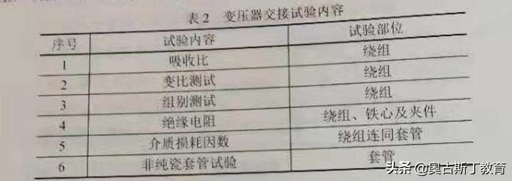 升压站安装完成后,进行了变压器交接实验,试验内容见表2。监理认为试验内容不全项目部补充了交接试验项目,通过验收。
