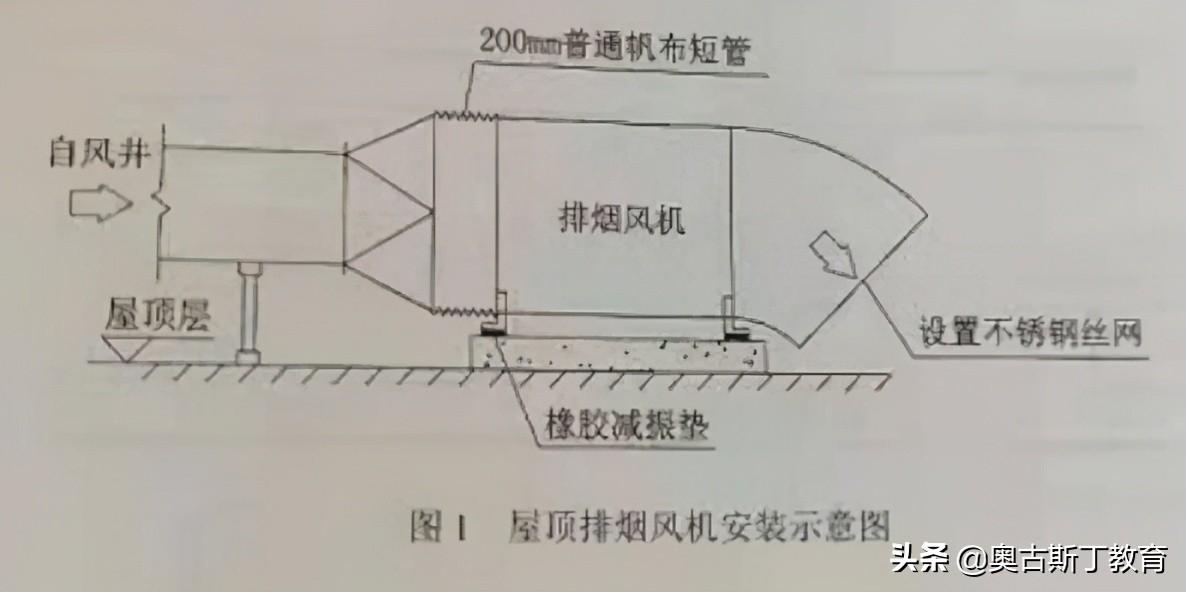 排烟风机进场报验后,安装就位于屋顶的混凝土基础上,风机与基础之间安装橡胶减震垫,设备与排烟风管之间采用长度200mm的普通帆布短管连接,见图1。监理单位在验收过程中发现,排烟风机的上述做法不合格,要求施工单位整改。