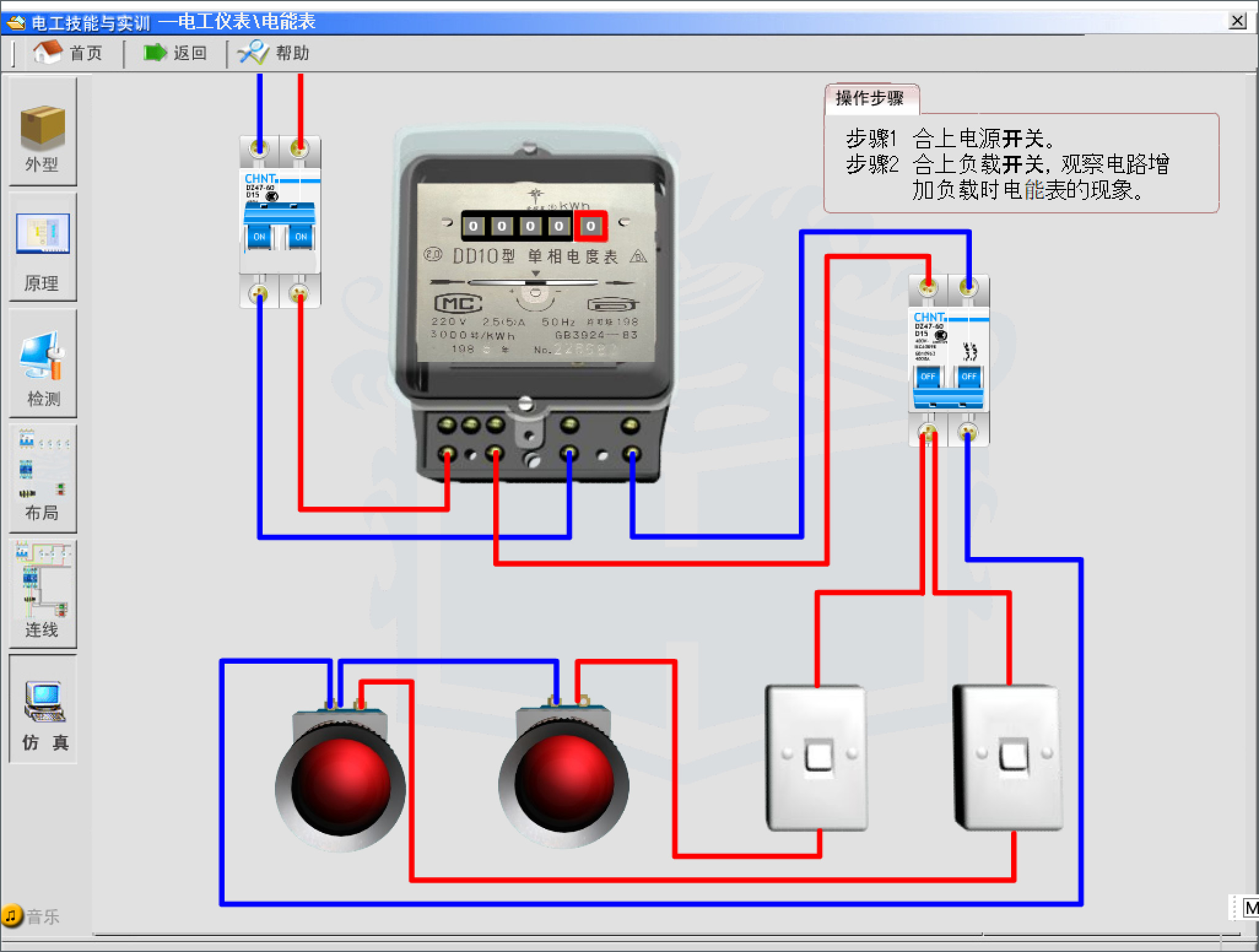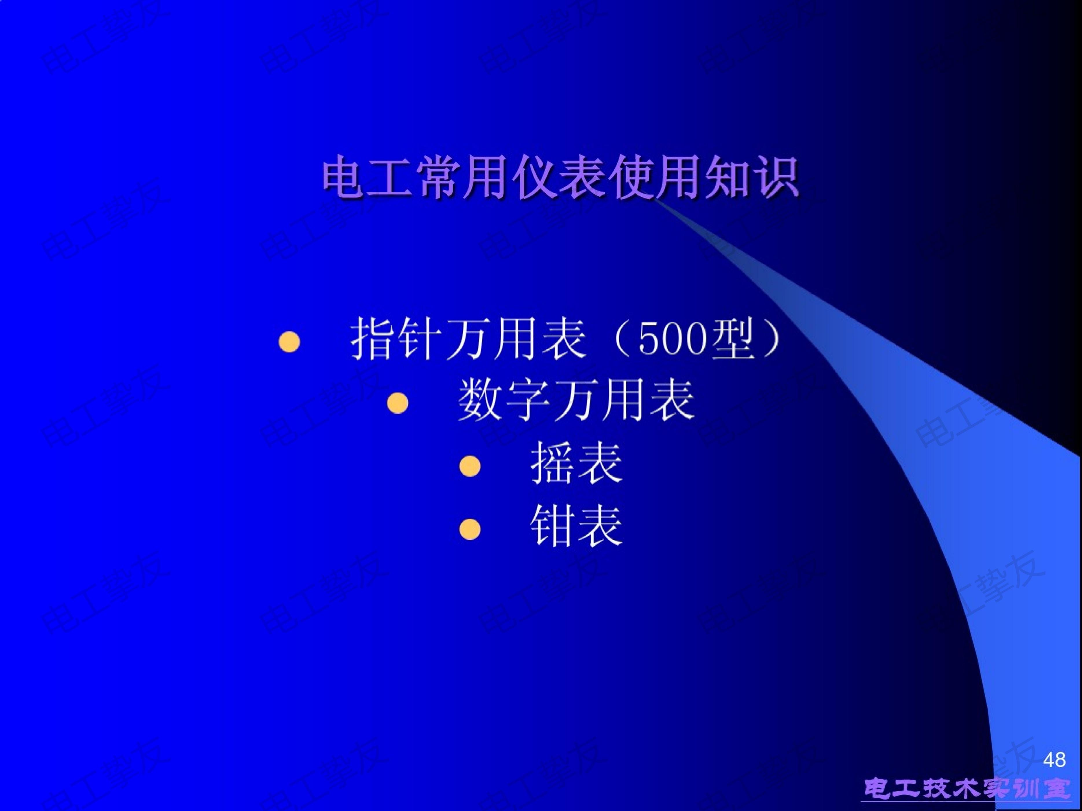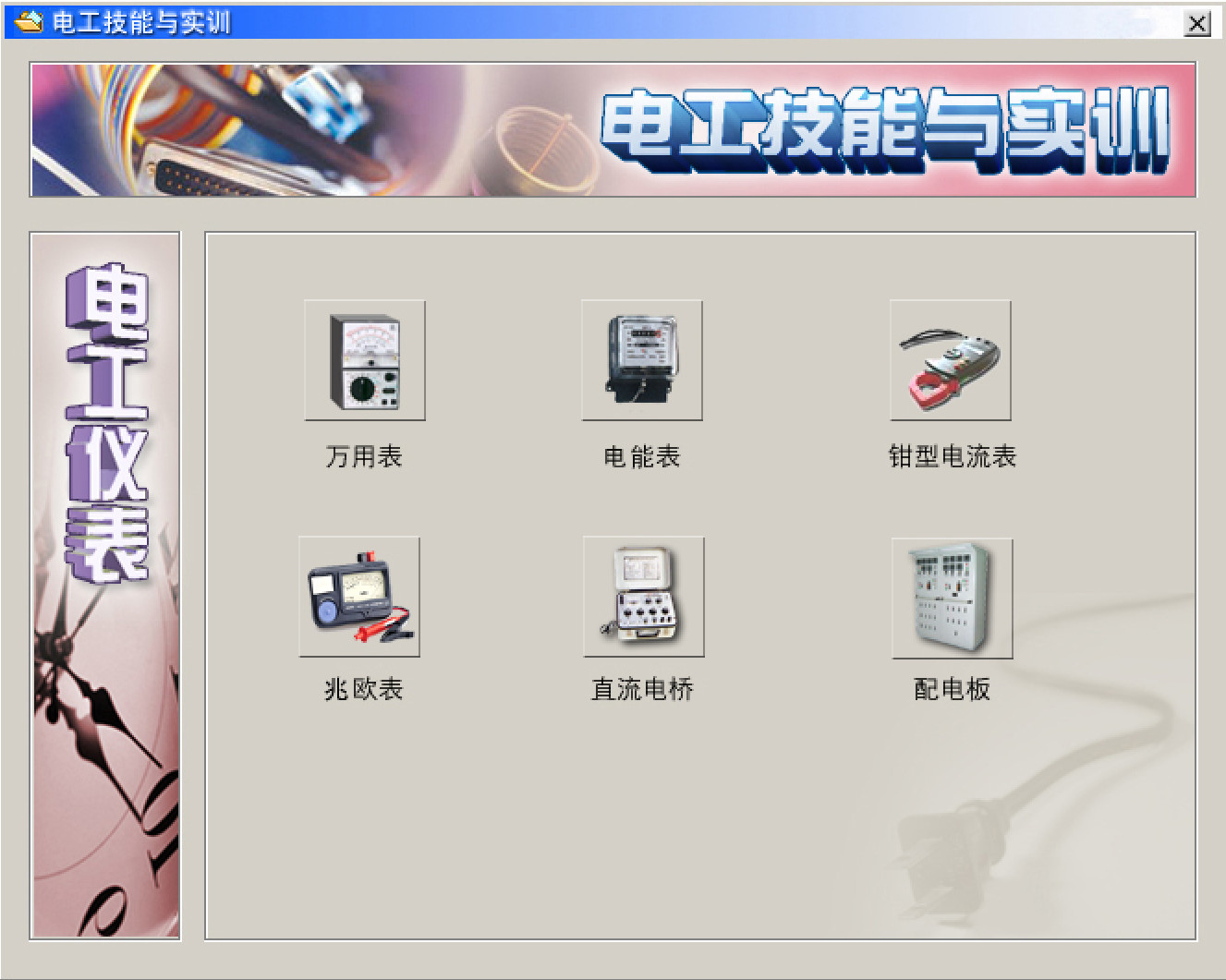 包含万用表、电能表、钳型电流表、兆欧表、直流电桥、配电板。每一个仪表包含外形、原理、检测、布局、仿真等内容,更容易理解。