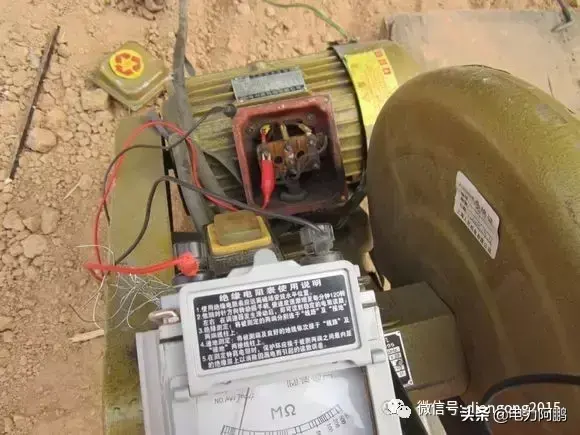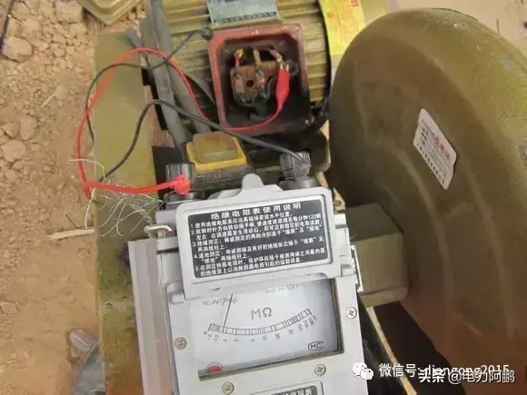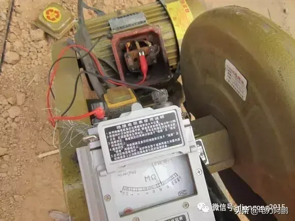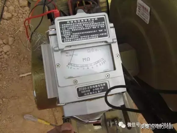 照片为证,请看漏保。这个表是500V的,遥测对地电阻两根表笔分别卡外壳和电机的三个接线柱,转速为每分钟120转,表要放平稳,这时看指针变化,如果指针偏相零,或者低于0.5兆欧,如0.1,0.2兆欧,断定电机烧了,如果大于0.5或者更大就证明电机没烧。原因就是漏保下面的电缆被农民工弟兄拉得太紧了,把三相电缆从楼保里拉出一根,缺相造成的。从左面看螺丝第一个N再往右看2,4,6,。是不是缺了一项C相。