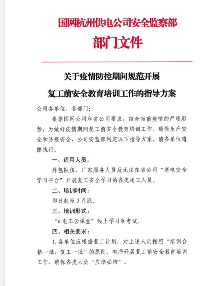 杭州网讯 近日,为做好复工前安全教育培训工作,确保生产安全和防疫安全,国网杭州供电公司发布《关于疫情防控期间规范开展复工前安全教育培训工作的指导方案》。