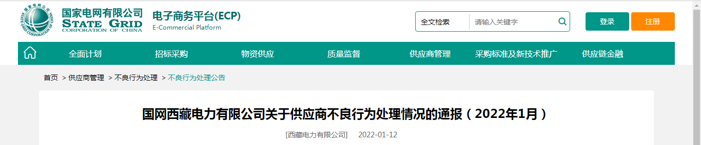 国网西藏电力有限公司关于供应商不良行为处理情况的通报 编号:2022-1