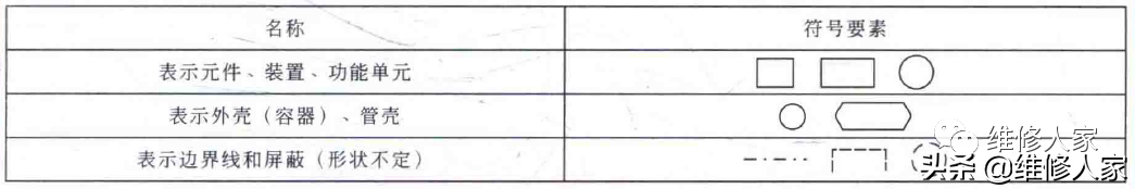 符号要素是指一种具有确定意义的简单图形,通常表示元件的轮廓或外壳,符号要素必须同其他图形符号组合使用。电工电路中常见的符号要素如下表所列;