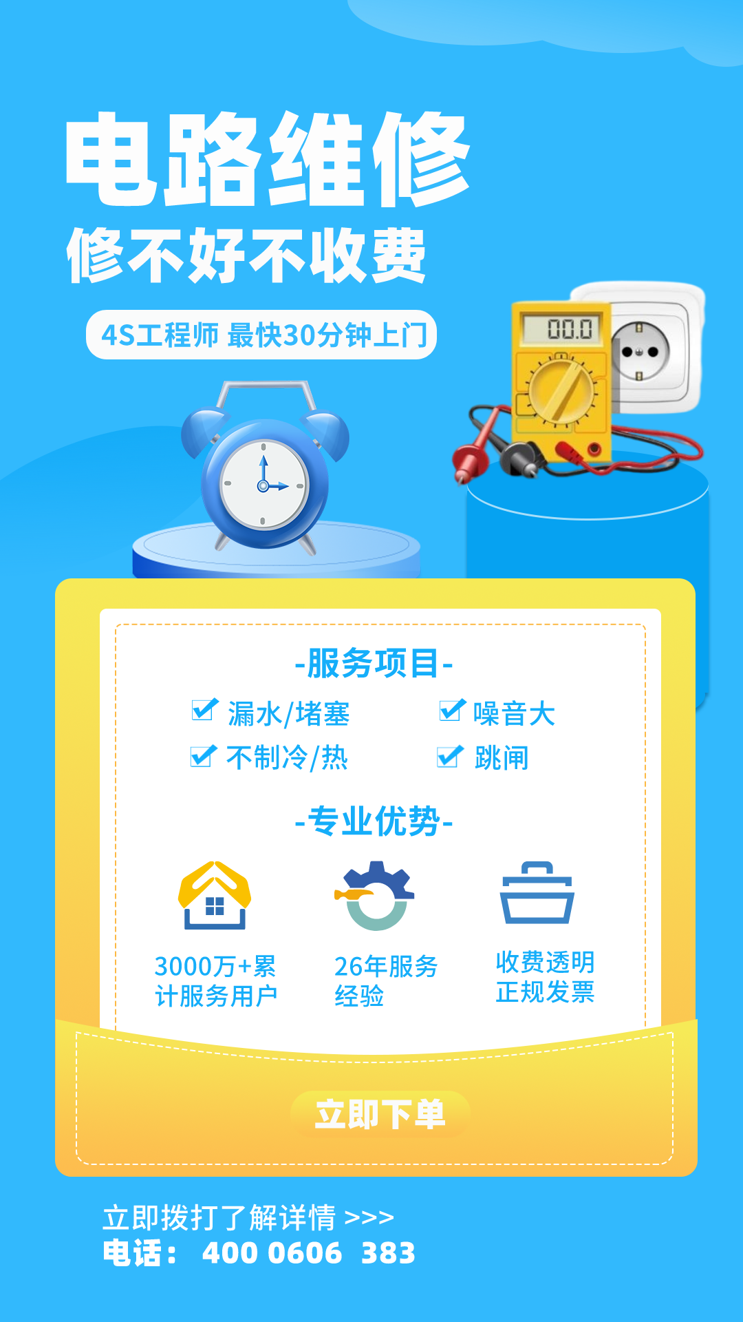电路维修电话:4000606383。 一步到家电路维修、马桶疏通、管道疏通,24小时上门服务电话,全国上门服务,就近安排,修不好不付费,保修期内免费维修!