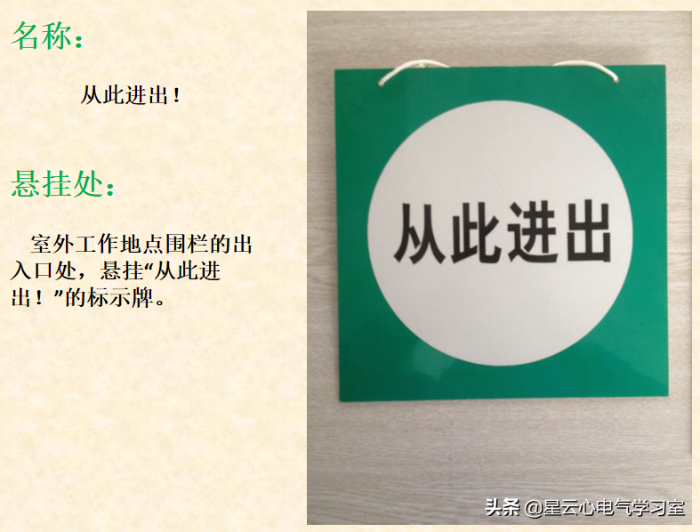 悬挂处:室外工作地点围栏的出入口处,悬挂“从此进出!”的标示牌。