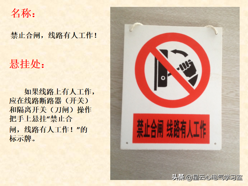 悬挂处:如果线路上有人工作,应在线路断路器(开关)和隔离开关(刀闸)操作把手上挂“禁止合闸,线路有人工作!”的标示牌。