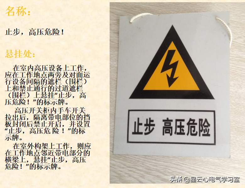 悬挂处:在室内高压设备上工作,应在工作地点两旁及对面运行设备间隔的遮栏(围栏)上和禁止通行的过道遮栏(围栏)上悬挂“止步,高压危险!”的标示牌。高压开关柜内手车开关拉出后,隔离带电部位的挡板封闭后禁止开启,并设置“止步,高压危 险 !”的标示牌。在室外构架上工作,则应在工作地点邻近带电部分的横梁上,悬挂“止步,高压危险!”的标示牌。
