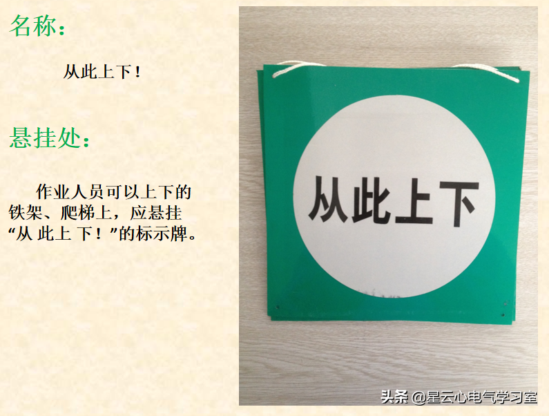 悬挂处:作业人员可以上下的铁架、爬梯上,应悬挂“从 此上 下!”的标示牌。