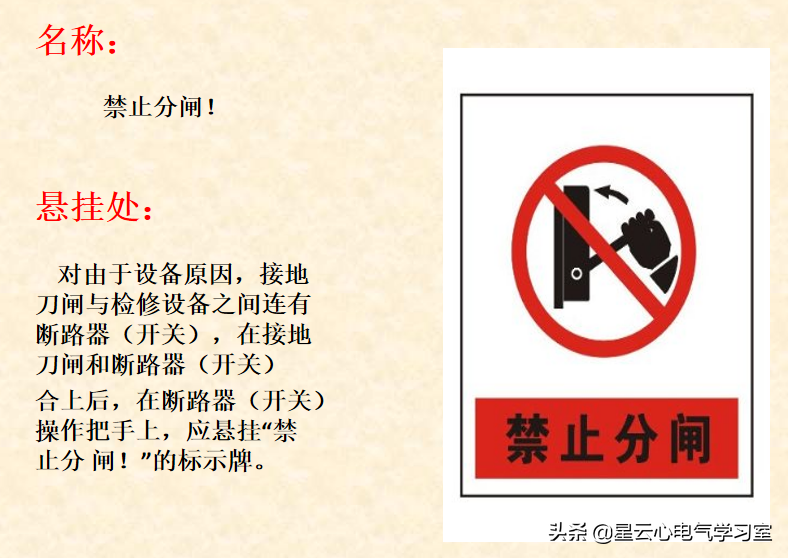 悬挂处:对由于设备原因,接地刀闸与检修设备之间连有断路器(开关),在接地刀闸和断路器(开关)合上后,在断路器(开关)操作把手上,应悬挂“禁 止分 闸!”的标示牌。