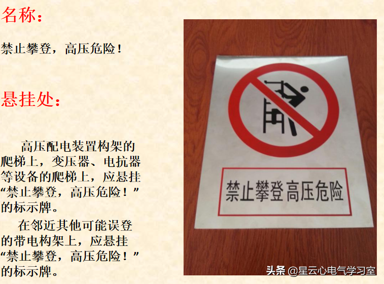 悬挂处:高压配电装置构架的爬梯上,变压器、电抗器等设备的爬梯上,应悬挂“禁止攀登,高压危险!”的标示牌。在邻近其他可能误登的带电构架上,应悬挂“禁止攀登,高压危险!”的标示牌。