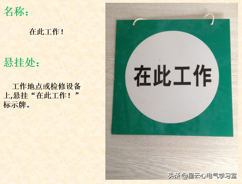 悬挂处:工作地点或检修设备上,悬挂“在此工作!”标示牌。