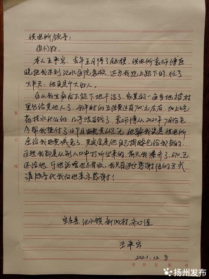“蒋所长,这是我村孤寡老人王承宏委托我转交的信,是感谢你所员工袁跃中的!”13日,扬州市宝应县氾水镇新阳村支部书记谢新顺来到氾水供电所,将一封感谢信送到该所所长蒋利荣的手里。